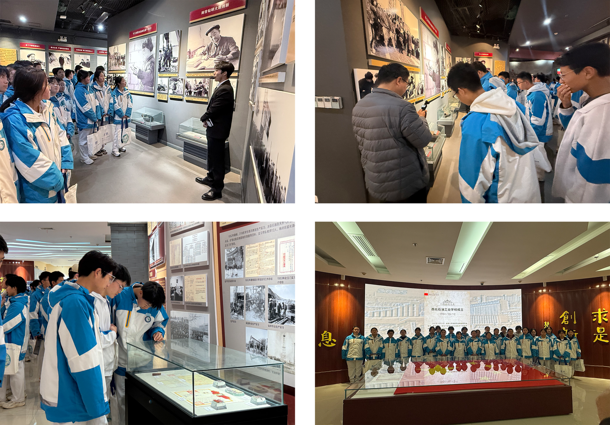 讲座结束后,师生们在志愿者的引导下有序前往铁人纪念馆和校史馆参观。在参观铁人纪念馆时,同学们被铁人王进喜“宁可少活二十年也要拿下大油田”的英雄气概所感染,为他身上所体现的“为国争光、为民族争气”的爱国主义精神所震撼。通过珍贵的照片、陈列的实物以及讲解员的讲述,同学们深刻理解了铁人的成长历程和铁人精神的内涵。在参观校史馆时,同学们充分了解到我校创建的历史使命和责任担当,深刻体会到石油人的家国情怀和奉献精神,真切感知到“爱国奉献、艰苦奋斗、科学求实、开拓进取”的办学精神,这种沉浸式的学习体验,不仅加深了同学们对我校校园文化的理解,也进一步坚定了他们考入理想大学的信心与决心。